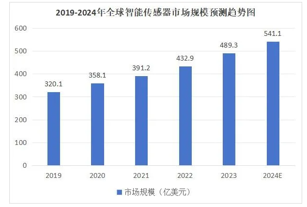 在科技的驱动下,全球智能传感器市场正以磅礴之势迅猛发展。数据显示,2022年全球市场规模已达432.9亿美元,2019至2022年间年均复合增长率高达10.59%。中商产业研究院的分析师预测,这股增长势头不减,到2024年市场规模预计将突破541.1亿美元。