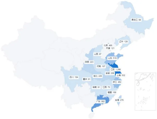 全球 MEMS 传感器技术的专利申请主要分布在中国、美国、日本等国家,其中,中国居首,美国次之,日本第三。国内沿海地区在 MEMS 传感器领域专利布局比较多,主要集中于江苏省、北京市、山东省、上海市、广东省等省市,江苏省排名第一。
