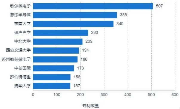 从 MEMS 传感器领域专利申请人分布来看,以企业为主,高校次之。其中,排名靠前的申请人中,有 2 位海外申请人,意法半导体以及罗伯特博世,分别排名第二和第九。排名前五的申请人分别为歌尔微电子、意法半导体、东南大学、瑞声声学和中北大学,专利申请量分别为 507 件、355 件、340 件、233 件和 209 件。