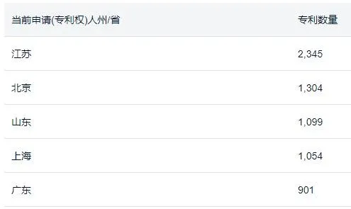 中国 MEMS 传感器领域的专利申请主要集中于江苏省(2345 件)、北京市(1304 件)、山东省(1099 件)、上海市(1054 件)、广东省(901 件)等省市,其余省市的专利量均低于 900 件。其中,江苏省累计专利量为 2345 件,排名全国第一主要申请人有苏州敏芯微电子、无锡华润上华科技和瑞声声学(南京)公司。北京市累计专利量为 1304 件,排名全国第二,主要申请人有京东方科技集团、北京时代民芯科技、北京微电子技术。山东省累计专利量为 1099 件,排名全国第三,主要申请人有歌尔微电子、共达电声、芯笙微纳电子。国内沿海地区在 MEMS 传感器领域专利布局比较多,研发投入比较大。