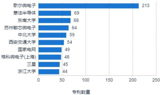 从中国传感器封装领域专利申请人分布来看,以企业为主,高校次之。其中,排名靠前的申请人中,国内申请人较多,如歌尔微电子、东南大学、苏州敏芯微电子、中北大学、西安交通大学、格科微电子、浙江大学,海外申请人在中国布局较少,但排名靠前,意法半导体第二。排名前三的申请人分别为歌尔微电子、意法半导体和东南大学,专利申请量分别为 213 件、69 件和 68 件。