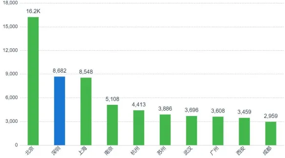 从有效专利量来看,深圳市智能传感器产有效专利数量为 2.37 万件,占全国智能传感器产业有效专利数量(370426 件)的 6.4%,在全国各地市中排名第二。排名第一的是北京,有 2.96 万件,上海有效专利量有 2.3 万件,排名第三。
