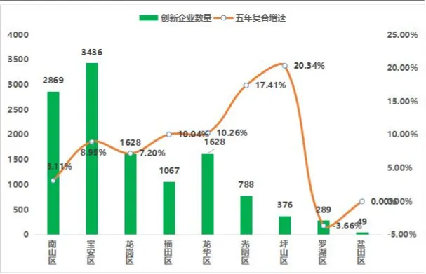 从创新企业增速来看,深圳市的相关创新企业数量的近五年复合增速为6.41%,其中,坪山区和光明区的近五年复合增速远高出深圳市创新企业数量的五年复合增速,高出了11个百分点以上。