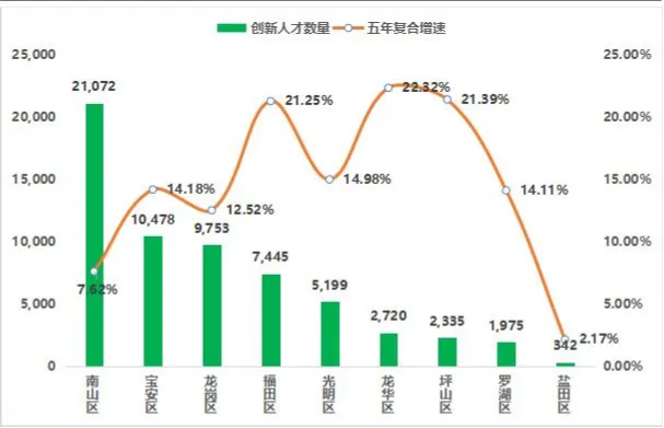 从创新人才增速来看,深圳市智能传感器产业创新人才数量的近五年复合增速为 11.51%,其中,除了南山区、盐田区近五年复合增速低于深圳市整体水平外,其余各区均高于深圳市创新人才数量的五年复合增速,尤其是龙华区、坪山区以及福田区,高出了10个百分点。