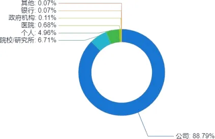 从智能传感器产业专利申请人类型来看,企业的专利申请量达到了4.3万件,占比88.79%。高校和科研所的专利申请量有 3305件,个人的专利申请量有2445件,分别占比6.71%和4.96%,申请量相差不大。