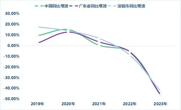 2019年至2023年的同比增速整体呈下降趋势,深圳市在此期间的同比增速略高于全国和广东省的同比增速。尤其2019年比全国的增速快,主要是因为深圳2019年在物理传感器、试验机方面的申请量增多。