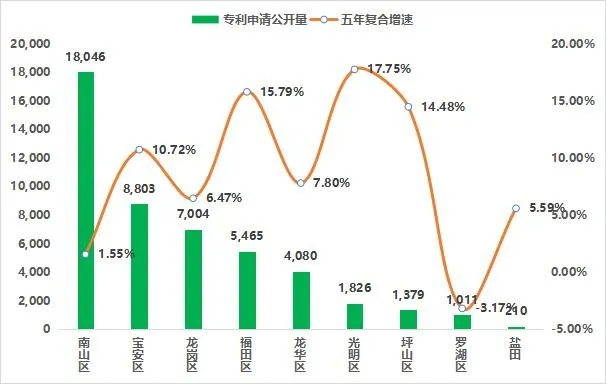 从专利申请量增速来看,深圳市的相关专利申请量的近五年复合增速为 5.88%,其中,光明区、福田区、坪山区、宝安区、龙华区的近五年复合增速均高出深圳市创新企业数量的五年复合增速,尤其是光明区,高出了 11 个百分点以上。