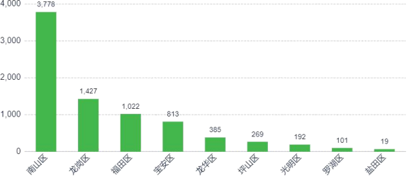 从深圳市各区来看,该市智能传感器产业的创新人才主要分布在南山区、宝安区、龙岗区,分别有21072人、10478人和 9753人,总共占深圳市智能传感器产业创新人才总数的67.3%。尤其是南山区的智能传感器产业创新人才数量远高于其他各区。