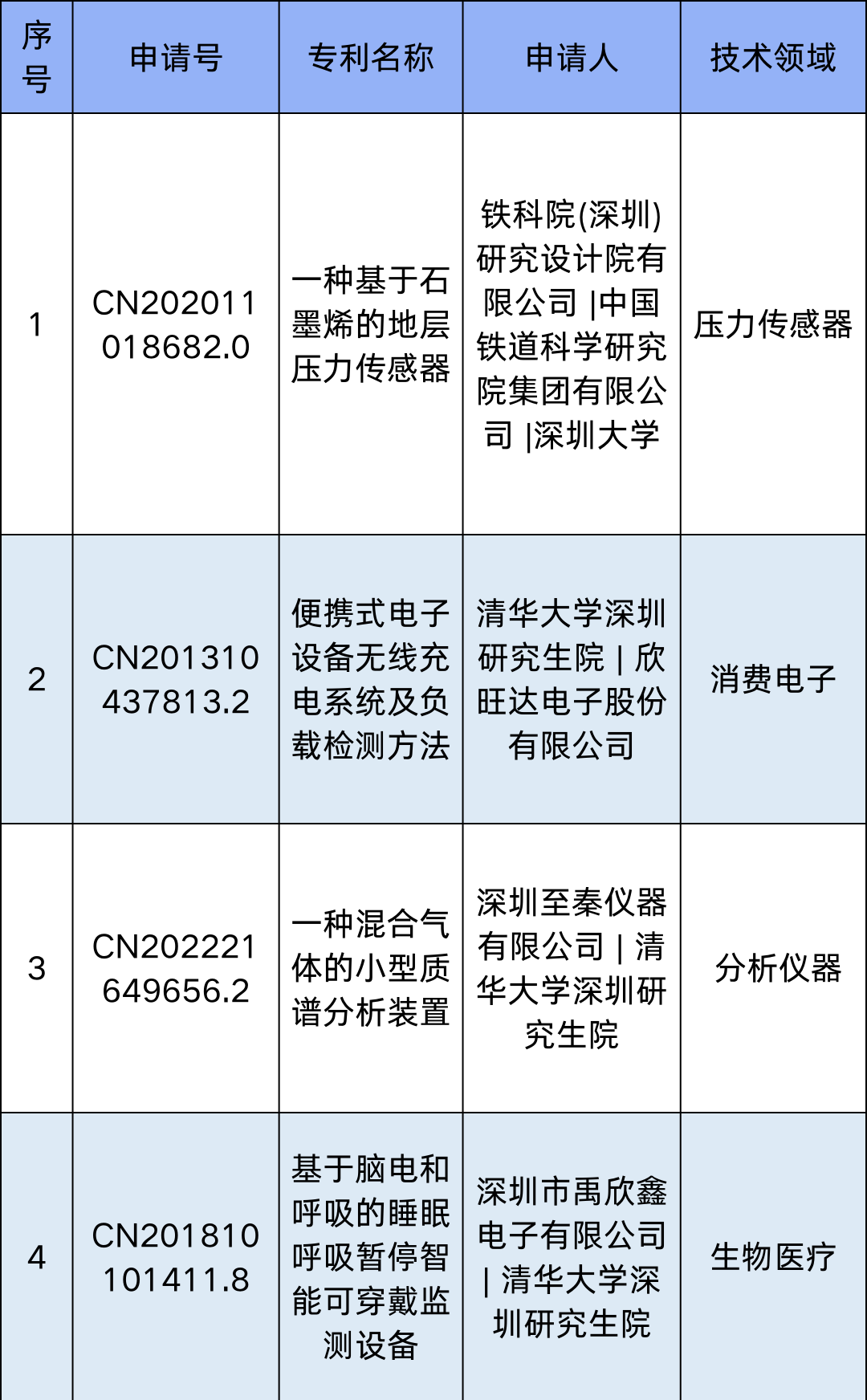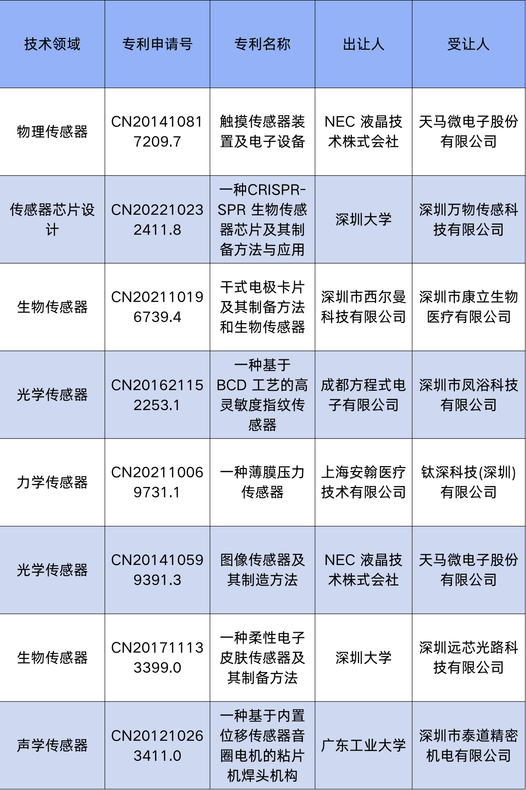 表 3 深圳市智能传感器产业涉及专利转让的代表专利清单