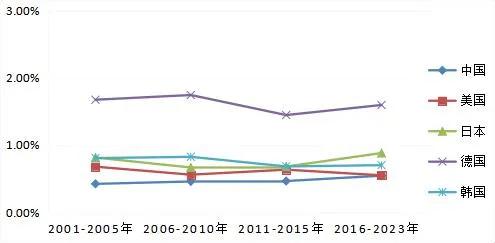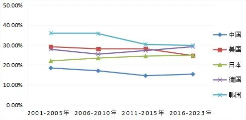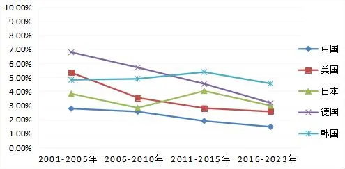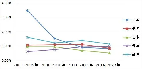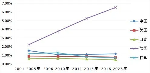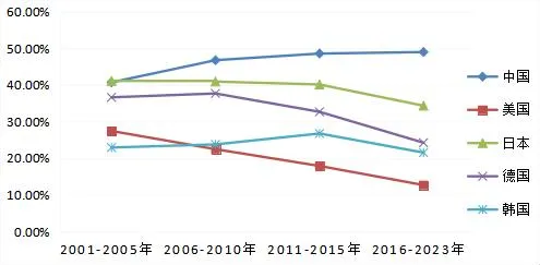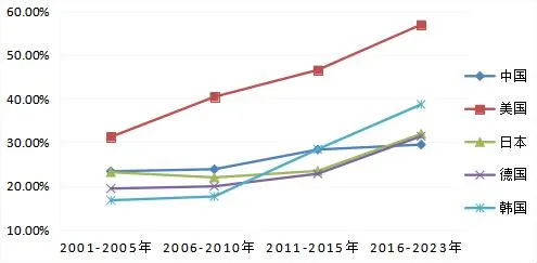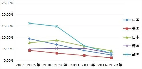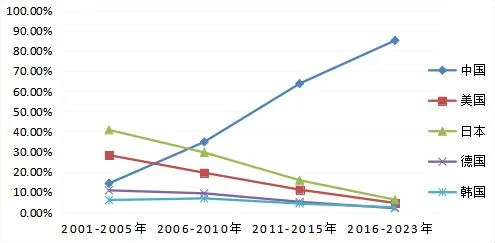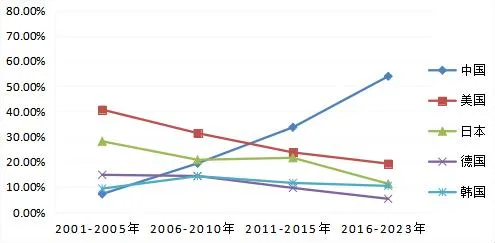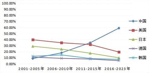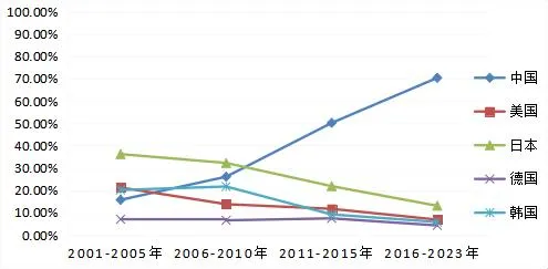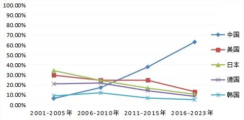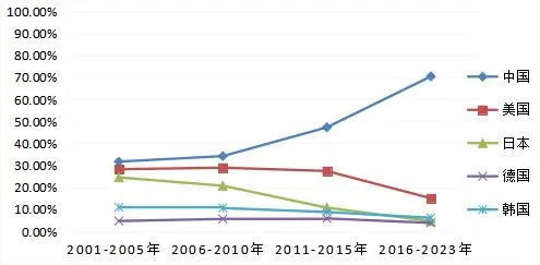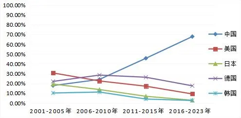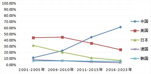 通过全球智能传感器产业 2001 年至今,中国、美国、日本、德国、韩国等五个主要国家专利申请量的时期变化,分析产业迁移趋势。区分 2001-2005 年、2006-2010 年、 2011-2015 年、2016-2023 年四个时期,主要国家统计数据如下: