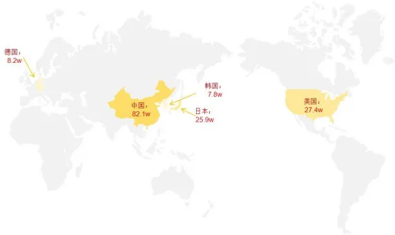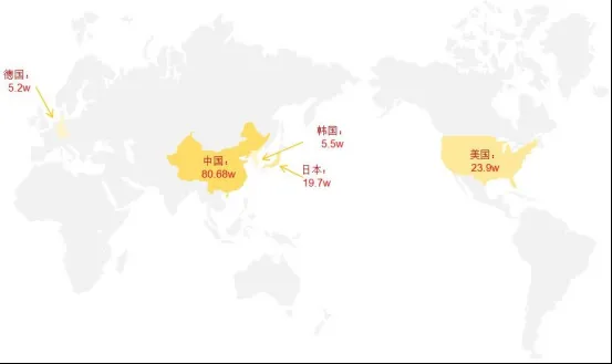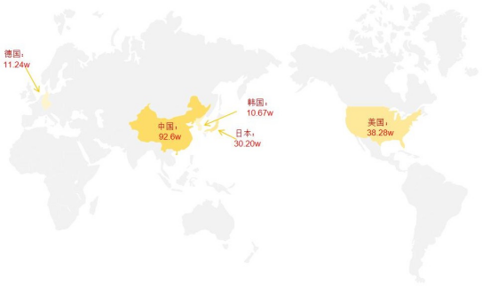 从全球各国产业创新人才分布来看,中国 92.6 万人、美国 38.28 万人、日本 30.20万人、德国 11.24 万人、韩国 10.67 万人。