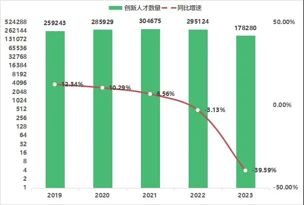 截至 2023 年 12 月底,全球智能传感器产业创新人才共 234.06 人,近五年全球智能传感器产业创新人才数量呈波动性变化,近五年复合增速为 5.04%,2019 年-2021 年期间创新人才数量有所上涨,但增速变缓,同比增速持续下降,2022 年开始出现负增长同比下降 3.13%。