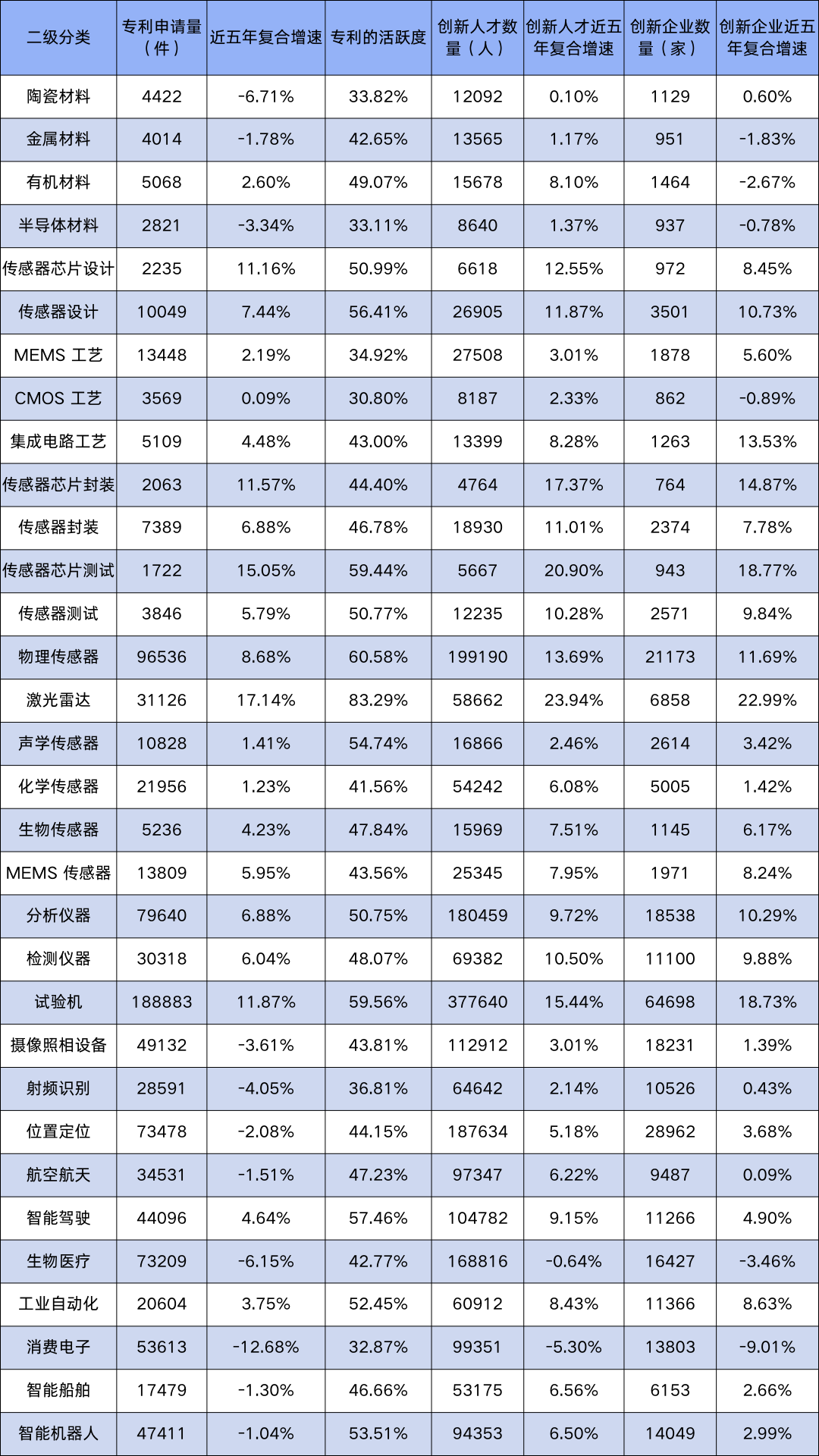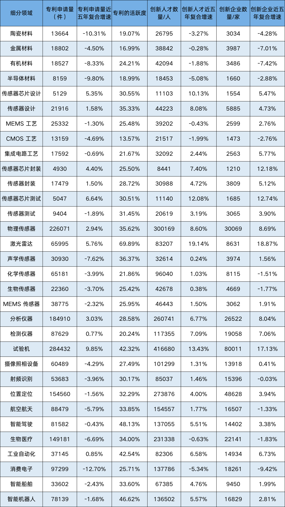 综合来看,试验机是智能传感器下游产业中发展速度最快的细分领域,且专利申请、创新人才以及创新企业的数量以及专利申请的五年复合增速均排名第一。